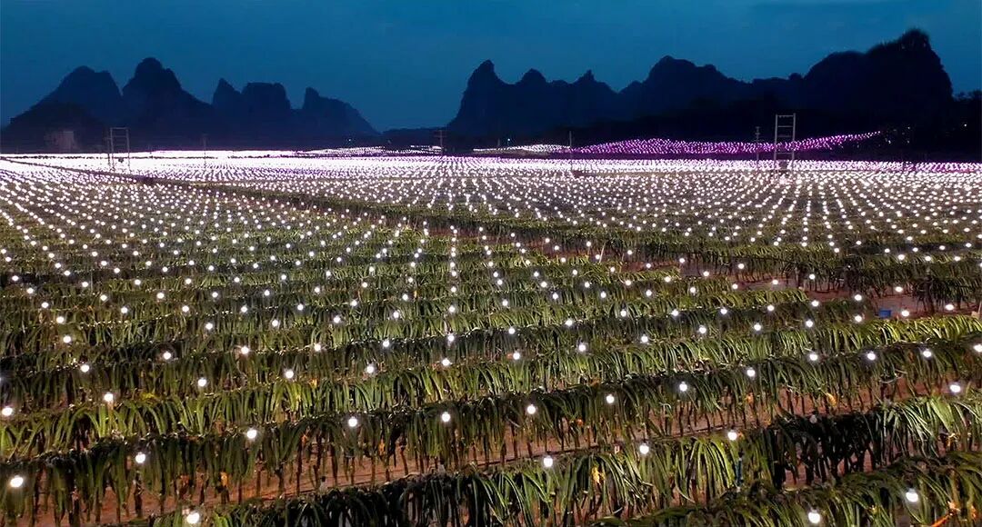 “暮色渐起,在隆安县连片火龙果种植基地,万盏催花灯化身繁星。”这是让网友惊艳的“灯光星海”场景。当地果园为延长火龙果光合作用时间,每当夜幕降临都会开灯进行补光作业,呈现这个浪漫的画面。