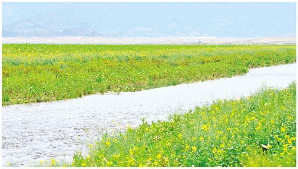▲灵川下黄村开在河流两岸的油菜花地很“春天”,成为网红打卡点。 记者周文琼 摄